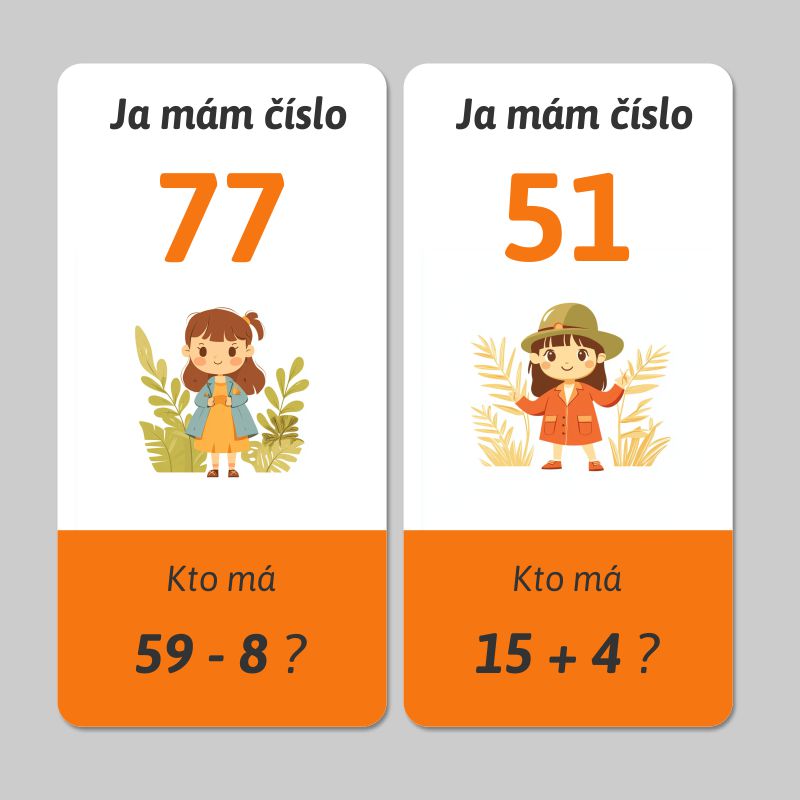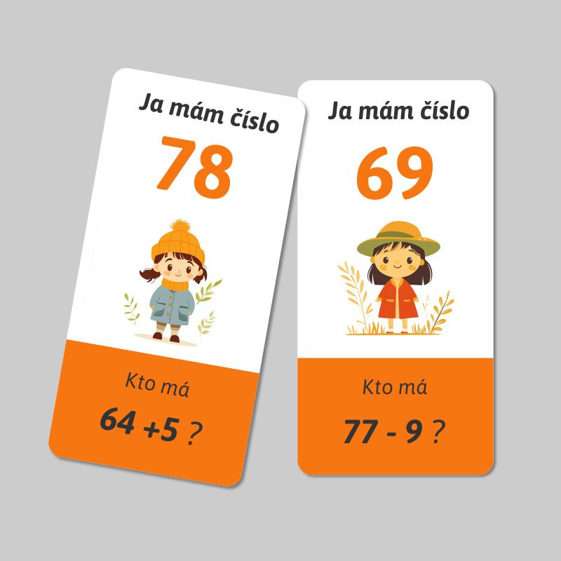 Hra „Ja mám, kto má“ je vynikajúcim nástrojom na precvičenie sčitovania a odčitovania dvojciferného a jednociferného čísla do 100 bez prechodu cez 10. Sada obsahuje spolu 24 kariet s 23 príkladmi. Zábava a vzdelávanie sa tak spoja do príjemnej a poučnej aktivity.