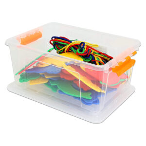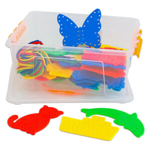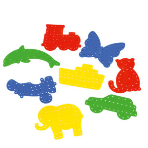 Jednotlivé predlohy sú vyrobené z pevného plastu a majú predvŕtané otvory na prevliekanie farebných šnúrok. Hravou formou sa tak trénuje koordinácia pohybu oko-ruka a jemná motorika. Vrátane praktického úložného boxu.